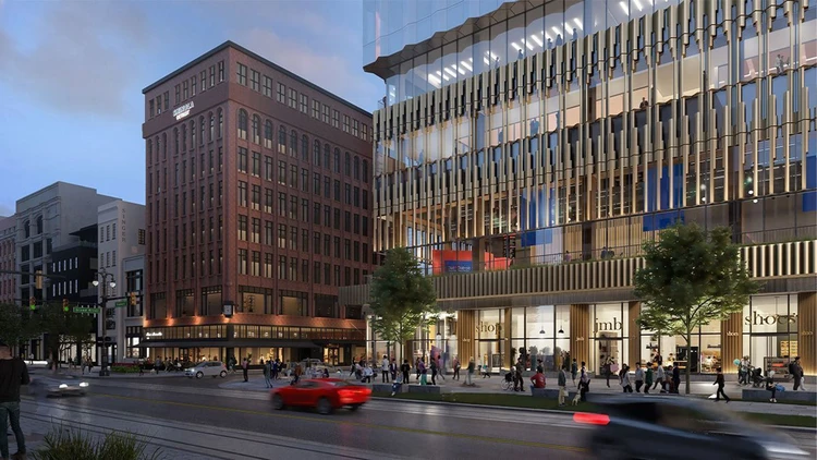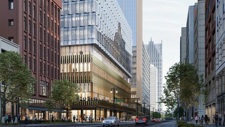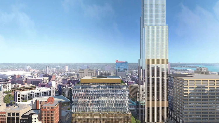 Hudson Site represents the transformation of the historic J.L. Hudson department store into a new urban hub set to come alive in the heart of Detroit. The project features a tower over 200 meters high, housing offices, retail spaces, restaurants, a hotel, a rooftop lounge, event and meeting areas, a fitness center with spa, residences, and parking to serve the continuously regenerating district. The entire development aims to revitalize the city center, encouraging the return of residents, commercial and cultural activities, and restoring civic pride for the city and surrounding region.