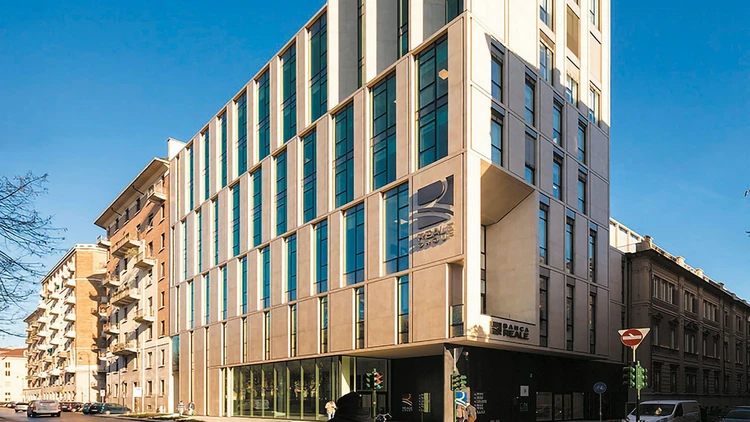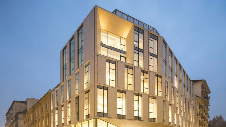 The project, designed by Iotti + Pavarani Architetti, stands out for its use of essential forms and precise proportions, inspired by the 18th- and 19th-century buildings in the area. The alternation of glazed surfaces and porcelain stoneware panels adds dynamism to the façade, while the color palette integrates with the historic architecture of the neighborhood, creating a landmark within Turin’s urban landscape.