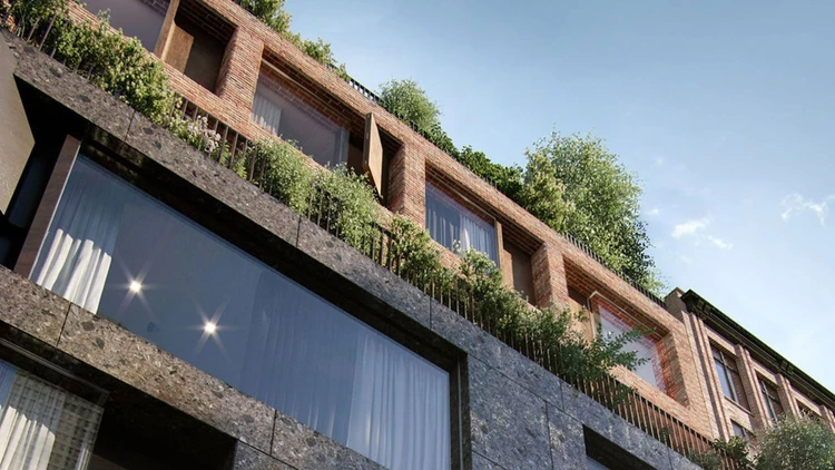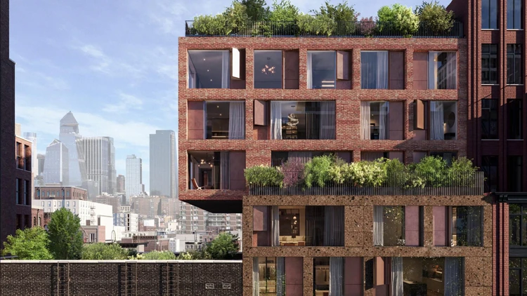 The Elisa is a refined boutique condominium located at the intersection of New York’s Meatpacking District, West Village, and Chelsea. Designed by the Brazilian firm Isay Weinfeld, the building stands out for its elegant and cosmopolitan architecture, characterized by designer finishes and warm tropical details. The façade, composed of classic red bricks and veined stone slabs, is punctuated by lush greenery that adds a natural and welcoming touch.