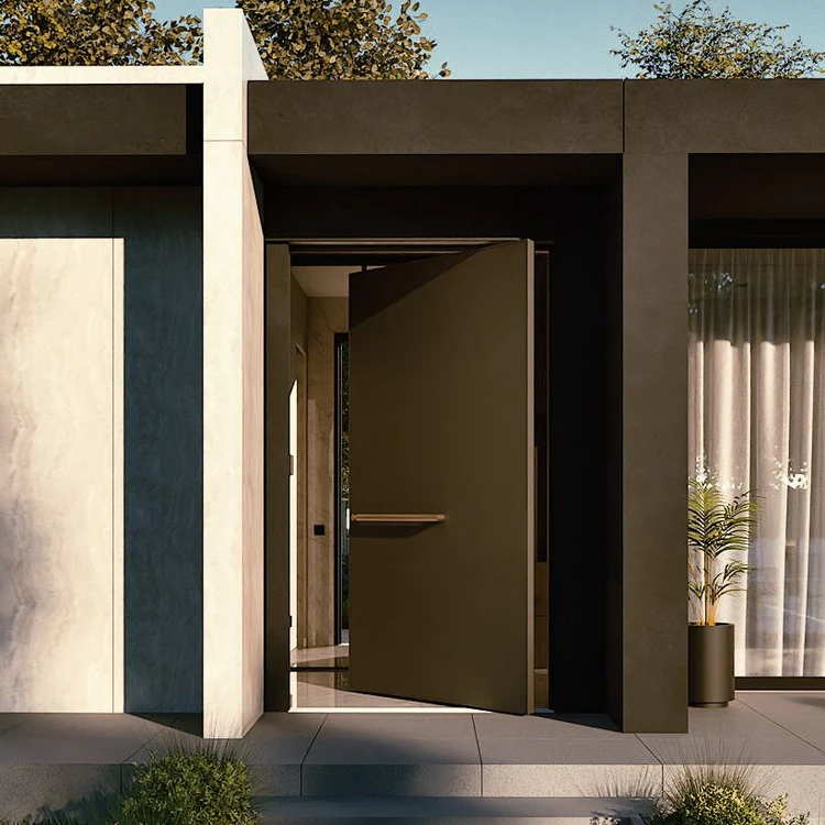 The pivot system offers wide, seamless access, maximizing space and convenience for both residential and commercial use. Its minimalist design fits perfectly into any modern villa entrance.