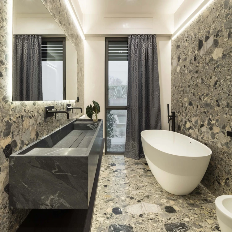 Interior solutions in natural stone, blending artisanal tradition and contemporary design.
