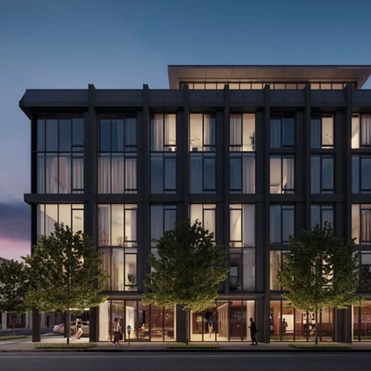 2102 East First Street: multifamily building with 12 units, dark-grey concrete cladding, and floor-to-ceiling windows. Amenities include a gym and lounge.
