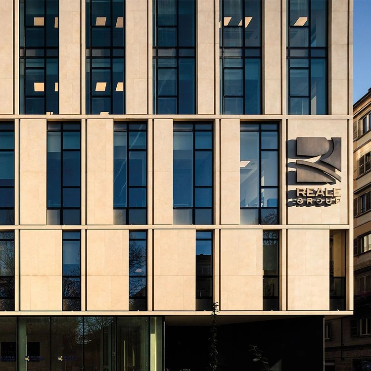 Real Mutua Assicurazioni façade: GammaStone Gres AIR panels combine lightness, modernity, and harmony with the historic context, alternating glass and porcelain gres for an elegant and lasting design.