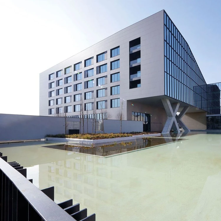Symbiosis, Milan: smart working center with offices and green spaces, clad in white GammaStone Gres Air, featuring large windows and a modern, practical design.
